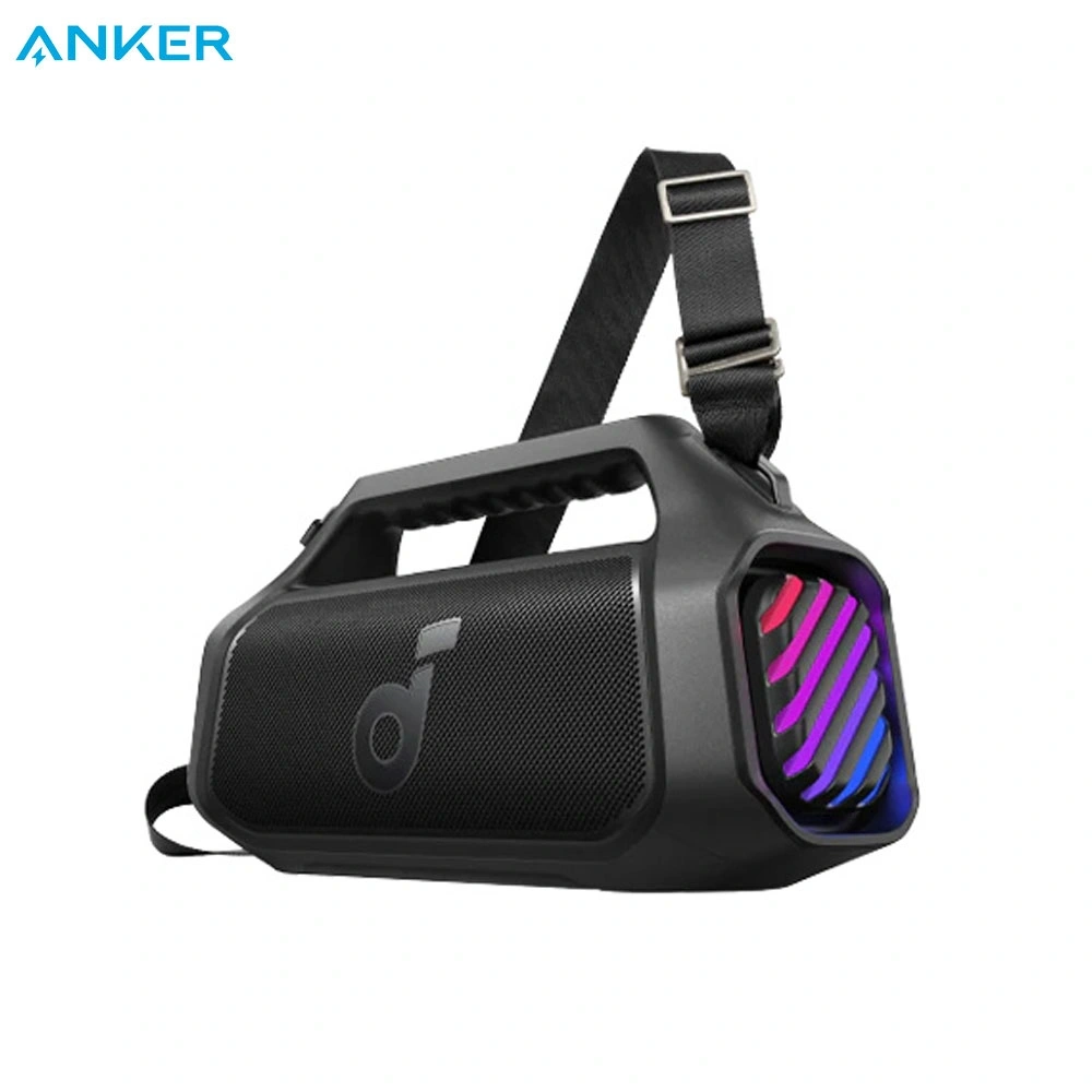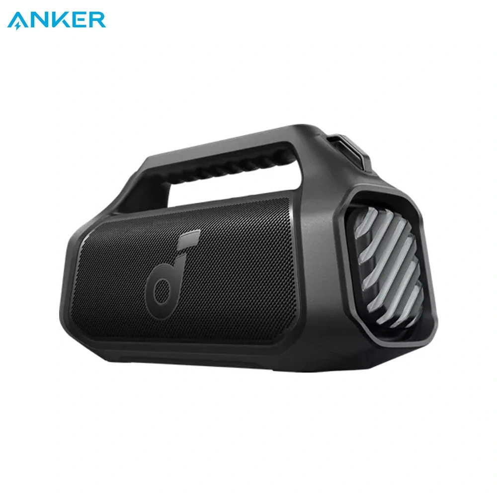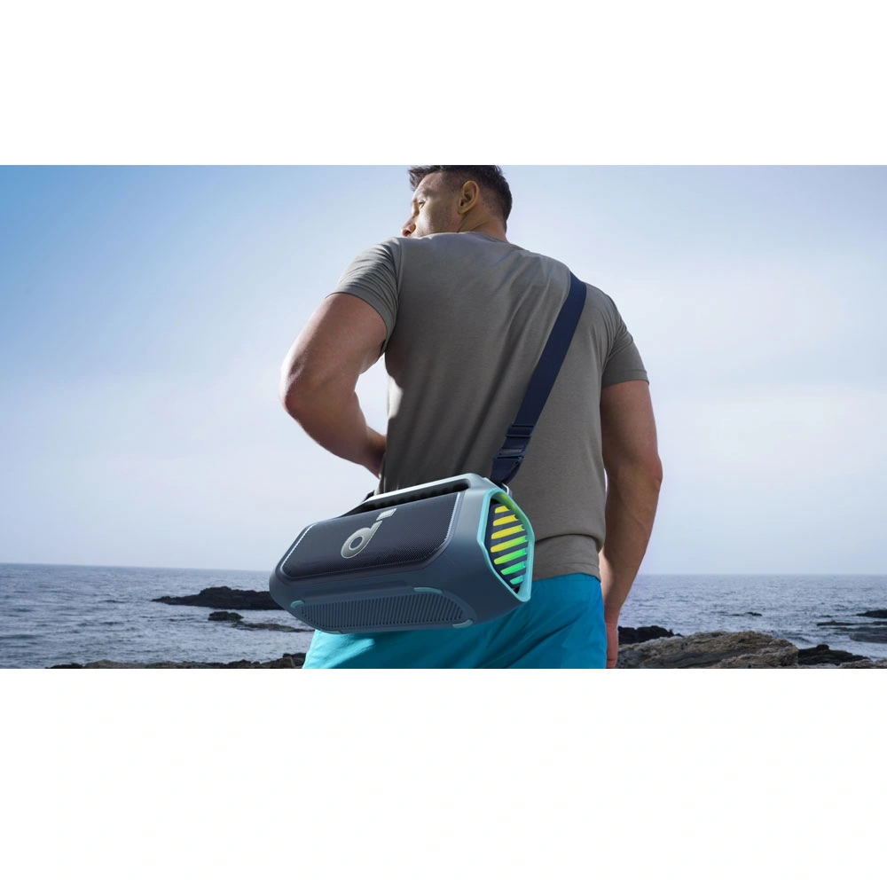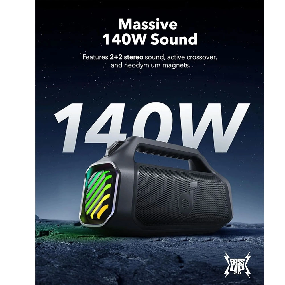 The Soundcore Boom 2 Plus is a 140W outdoor Bluetooth speaker with BassUp 2.0 technology, featuring two 50W woofers and two 20W tweeters that deliver sound down to 40Hz. It's IPX7 waterproof and floats, runs for about 20 hours on a charge, and includes 30W fast charging plus a 10W power bank function. The speaker has Bluetooth 5.3, an aux input, a customizable EQ, and a music-synced light show. It comes with a carrying strap and handle, and PartyCast 2.0 lets you link multiple units together for outdoor use.