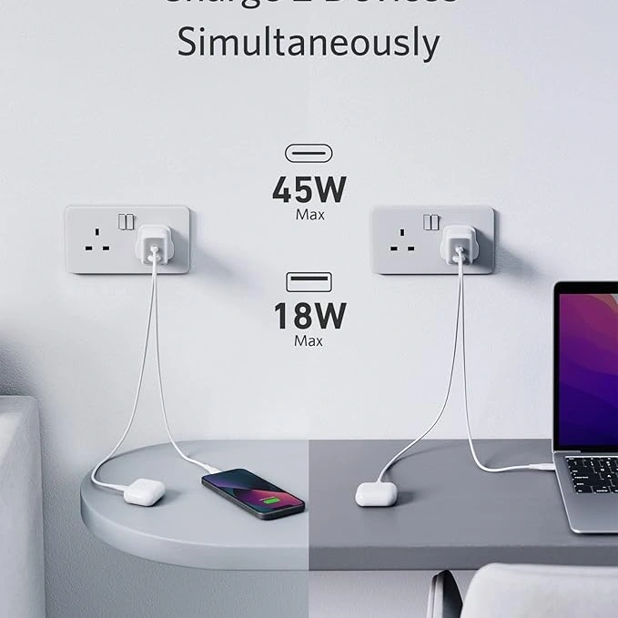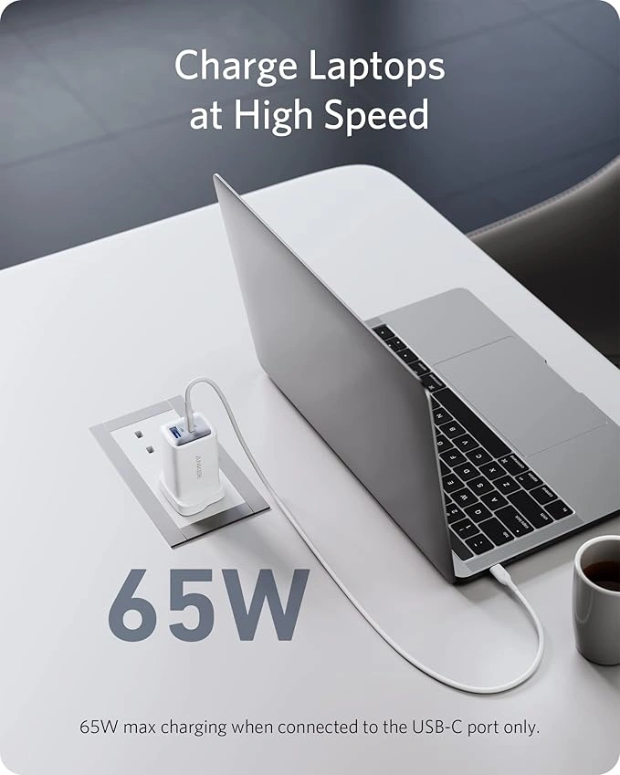 The Anker 65W USB‑C 725 Charger is a small yet powerful dual‑port wall charger that delivers fast, stable power with PowerIQ 3.0 and PPS support for smartphones, tablets, and laptops. With a 65W USB‑C port and a USB‑A port, it can charge a MacBook Air or MacBook Pro 13″ at high speed while charging another device like an iPad, Galaxy, Pixel, or iPhone at the same time. Its GaN II‑powered design makes it ultra‑compact and travel‑friendly, ideal for daily use or trips. This charger works with USB‑C notebooks and tablets, plus most USB‑A devices, and is perfect for students, professionals, and travelers who want reliable multi‑device charging in one small adapter.