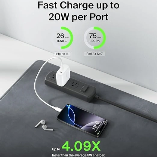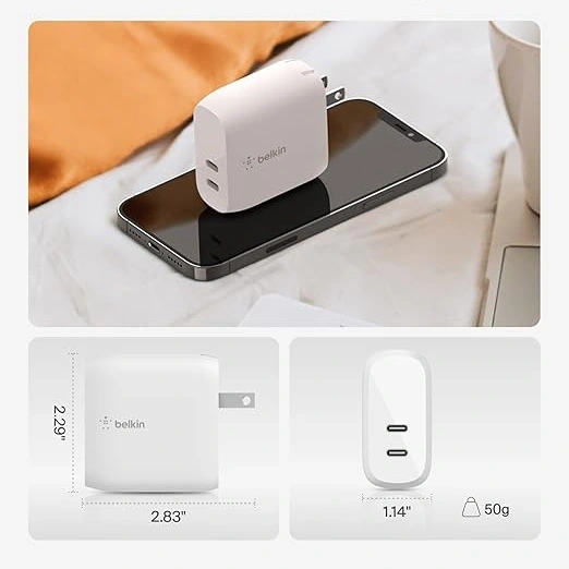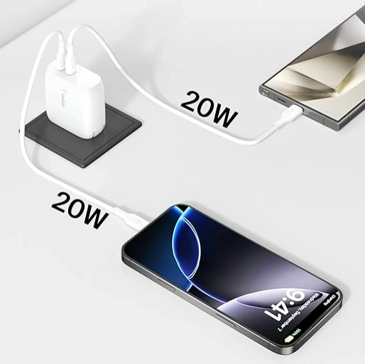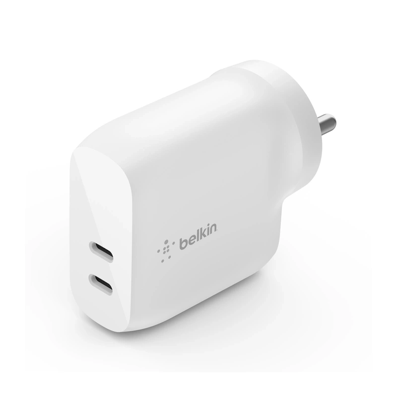 The Belkin 40W Dual USB‑C PD Wall Charger is a compact and reliable dual‑port charger that delivers fast and efficient charging for modern USB‑C devices. With two USB‑C Power Delivery ports delivering up to 20W each, it lets you charge a Google Pixel, iPhone, Samsung Galaxy, iPad, or other USB‑C PD‑enabled devices at the same time without slowing down. Its foldable and lightweight design makes it great for daily use, office setups, or travel, and the smart PD technology ensures safe, optimized charging every time. Whether you’re charging a phone, tablet, or other gadgets together, this charger is perfect for users who want dependable, multi‑device fast charging in one compact adapter.