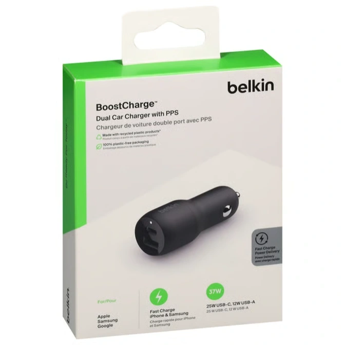 Belkin is synonymous with reliability. This dual car charger is not only designed for speed but also for safety. Integrated protection systems safeguard your valuable electronics against overheating, overcurrent, and short circuits. Furthermore, you can feel good about your purchase; this product is made with recycled plastic materials* and comes in 100% plastic-free packaging, aligning high performance with eco-conscious manufacturing. For travelers, commuters, and families, it is the ultimate reliable power solution.