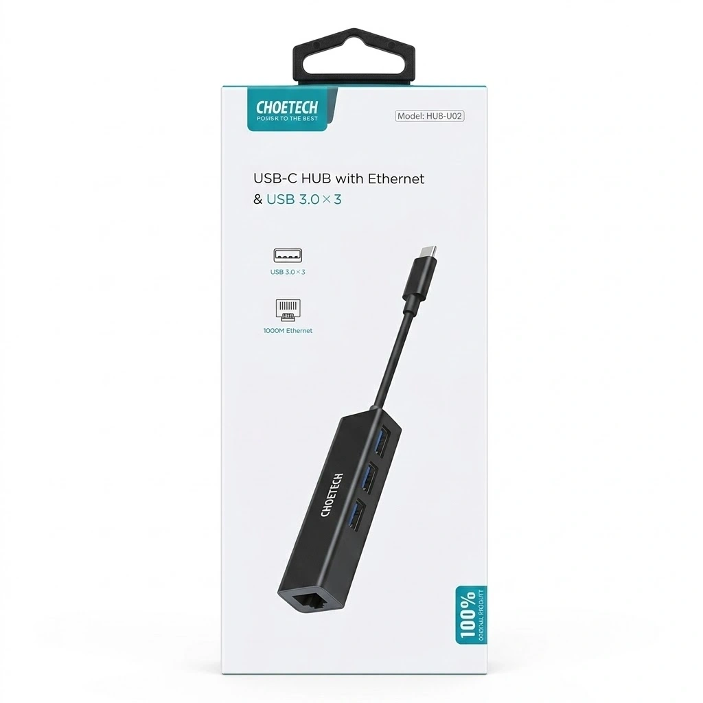 The Choetech HUB-U02 is the ultimate productivity companion for users who need reliable connectivity in a mobile world. By combining a high-speed Gigabit Ethernet port with three versatile USB 3.0 ports, this hub solves the common problem of limited ports on modern slim laptops. Whether you are working from a home office, a cafe, or a hotel, you can enjoy the security of a wired internet connection alongside the convenience of multiple peripheral attachments. The sleek, durable finish perfectly complements premium devices like the MacBook Pro and Chromebook. This hub ensures your workflow remains uninterrupted, offering a high-performance solution for data management, stable networking, and effortless multi-tasking across all your Type-C devices.