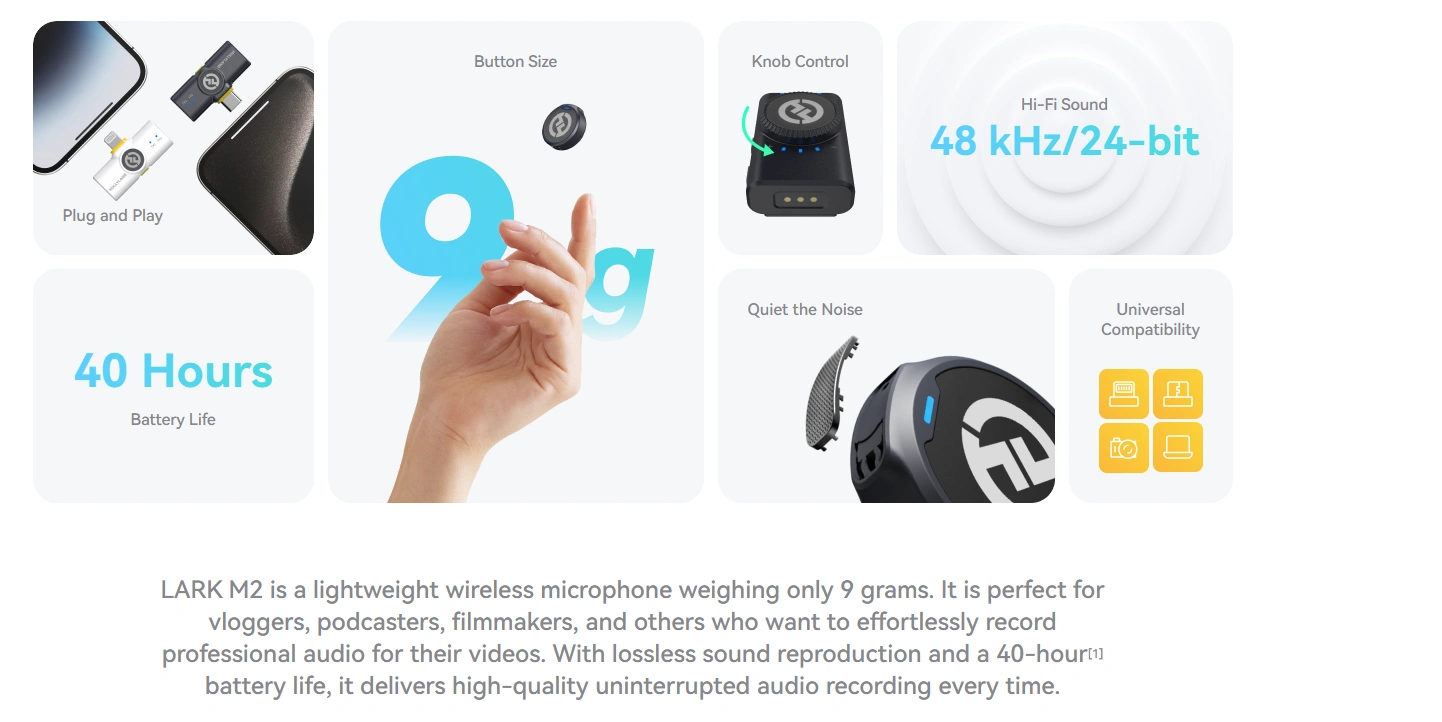 Hollyland Lark M2 Wireless Mic Type-C is a compact and powerful wireless microphone system designed for Type-C devices such as Android smartphones, tablets, and laptops, offering professional-grade clear audio with stable long-range transmission and built-in smart noise cancellation for clean recordings even in noisy environments. Its ultra-lightweight clip-on design ensures a minimal on-camera appearance while the plug-and-play setup allows instant use without apps or complex pairing, making it perfect for vloggers, YouTubers, interviewers, podcasters, online teachers, social media creators, and field reporters who need portable, reliable, and high-quality wireless audio. The key benefits include easy mobility, time-saving setup, improved sound clarity for professional content, enhanced audience engagement, and a dependable recording solution for both indoor and outdoor shooting.