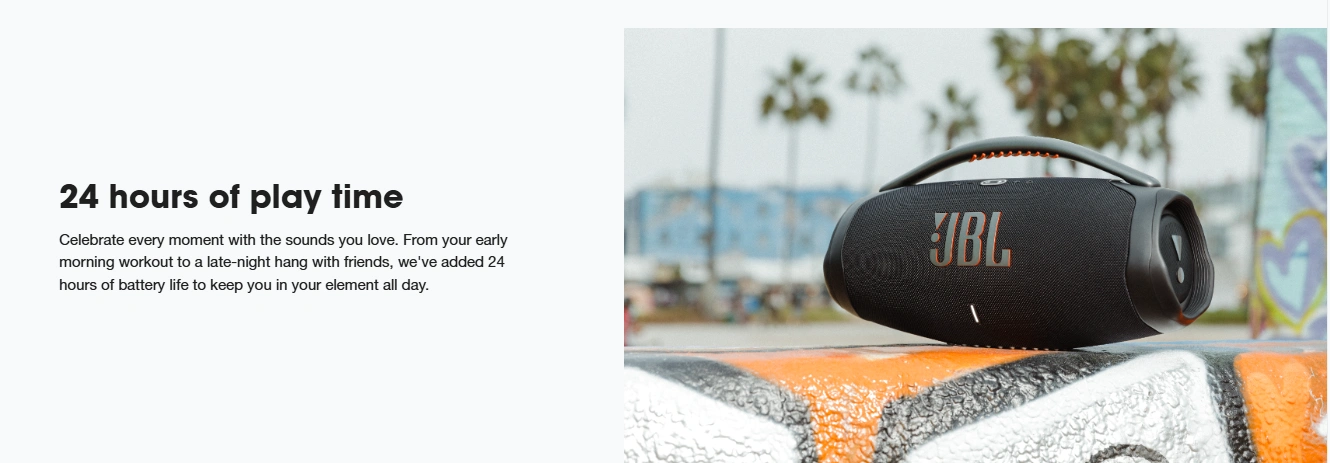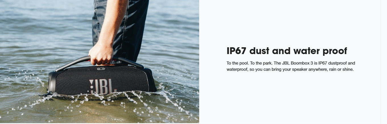 With up to 24 hours of battery life, the Boombox 3 keeps your music going all day and night on a single charge. Its IP67 waterproof and dustproof rating makes it ideal for outdoor adventures, pool parties, and travel without worry. :contentReference[oaicite:1]{index=1}