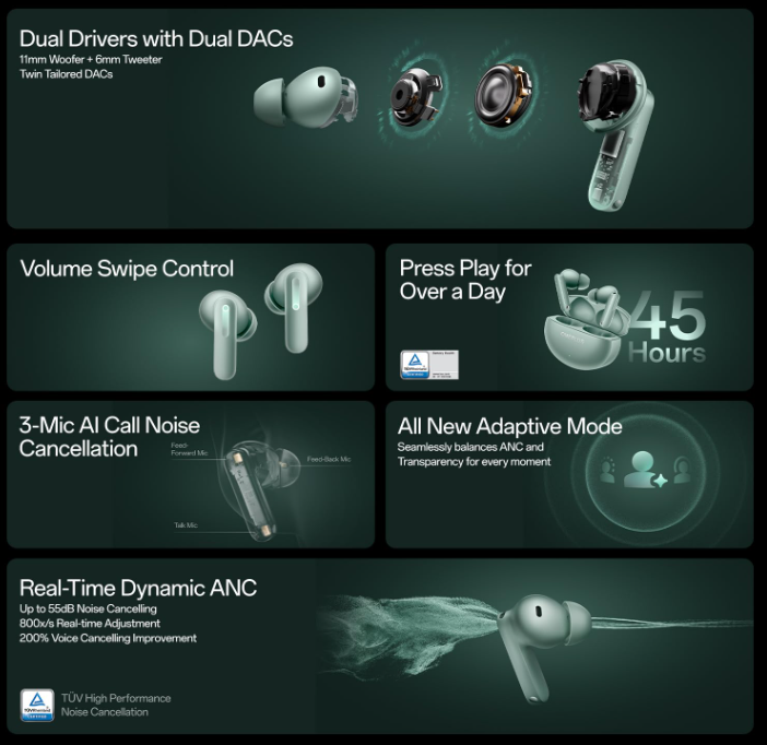 49dB Smart Adaptive Noise Cancellation: Block out unwanted noise with flagship-level ANC that intelligently adjusts to your surroundings.