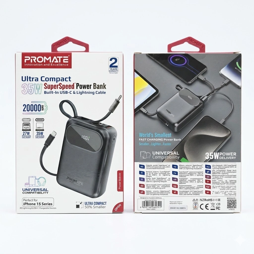 The Promate Ultra Compact Power Bank is a powerful and portable charging solution with a large 20000mAh capacity. It supports fast charging up to 35W, so your devices charge quickly when you need them most. With built-in USB-C and Lightning cables, you don’t have to carry extra wires, making it very convenient for everyday use.