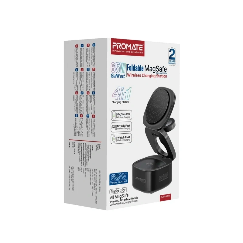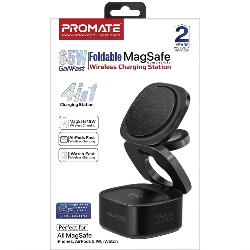 Upgrade to the ultimate convenience and efficiency with the Promate 65W GaNFast 4-in-1 Charging Station. This sleek, foldable hub eliminates cable clutter by centralizing the power for your entire mobile ecosystem. Engineered with premium Gallium Nitride (GaN) components, it delivers a powerful 65W total output, ensuring all your devices charge rapidly and safely. The dedicated 15W MagSafe-compatible magnetic charger flawlessly aligns and boosts your iPhone, while specialized zones provide fast wireless power for your Apple Watch and AirPods simultaneously. It is the perfect all-in-one charging solution for modern tech users.