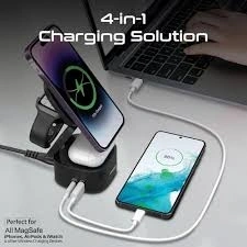 Ultimate 4-in-1 Charging Hub: Powers four essential devices simultaneously, including a dedicated iPhone MagSafe spot, Apple Watch charger, and two high-output charging pads/ports for other devices like AirPods.