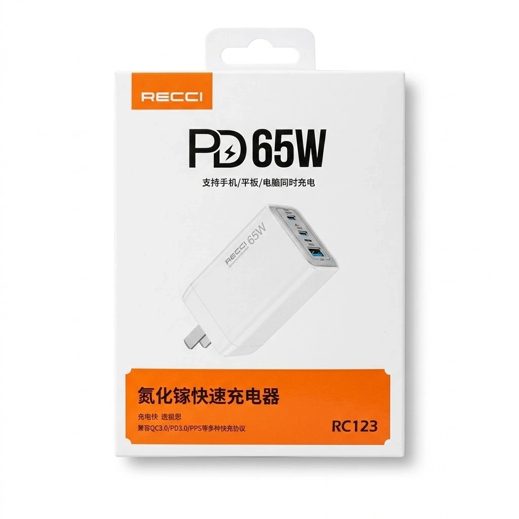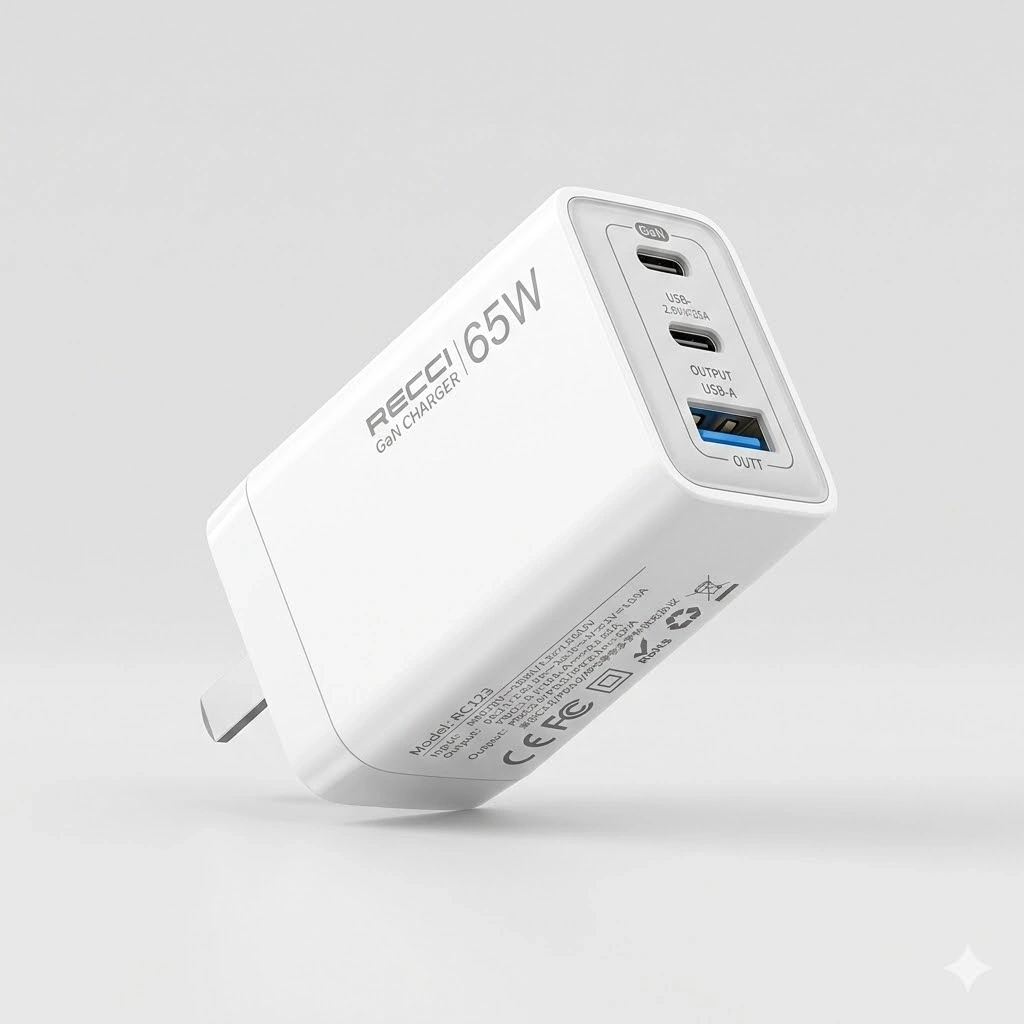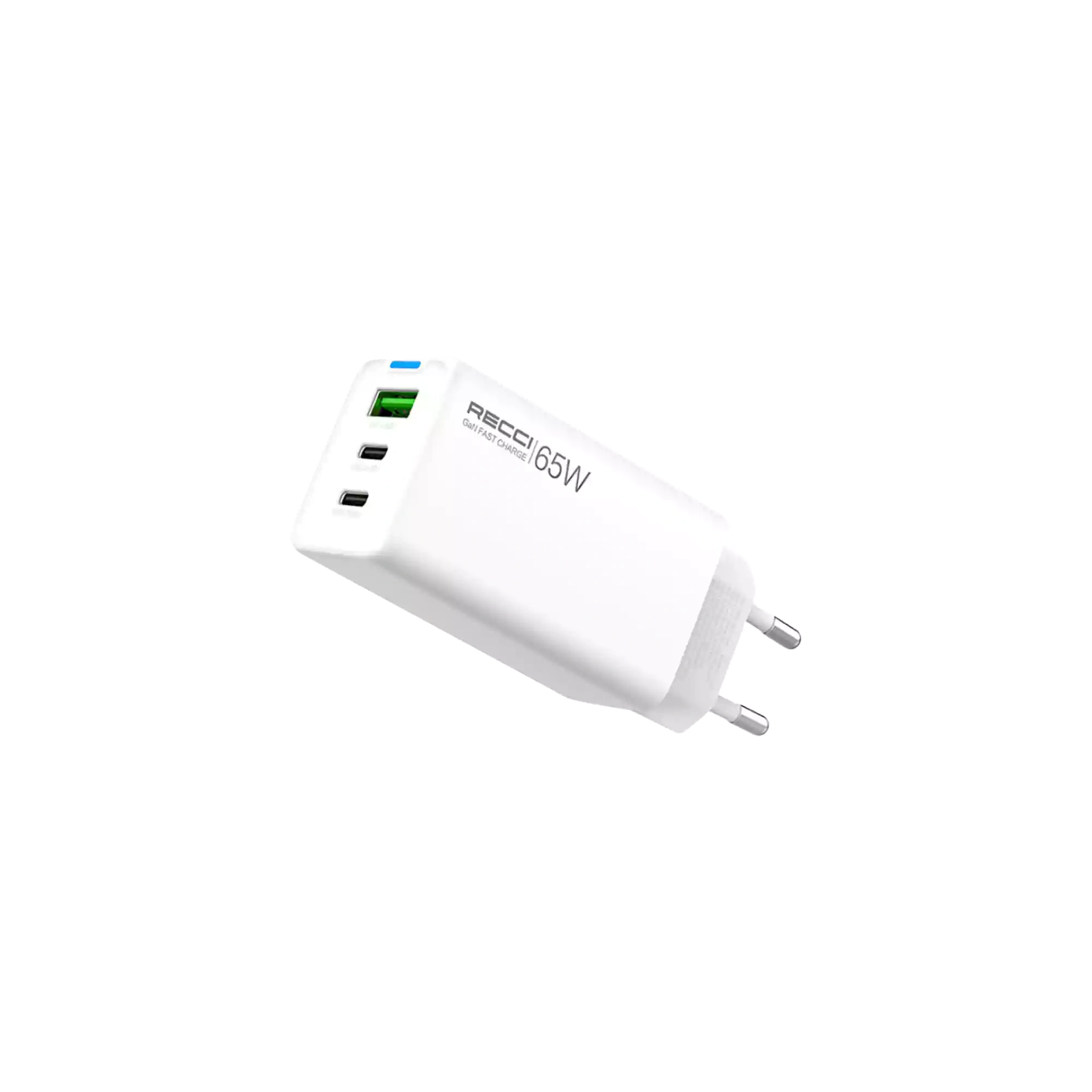 The Recci 65W Charger (often referred to as RC123/RC109E in the brand line) is a versatile GaN-based wall charger designed to power up multiple devices quickly and safely. With a total power output of up to 65 W, its USB-C PD ports can charge power-hungry gadgets such as laptops and tablets, while the USB-A port provides fast charging for other accessories.