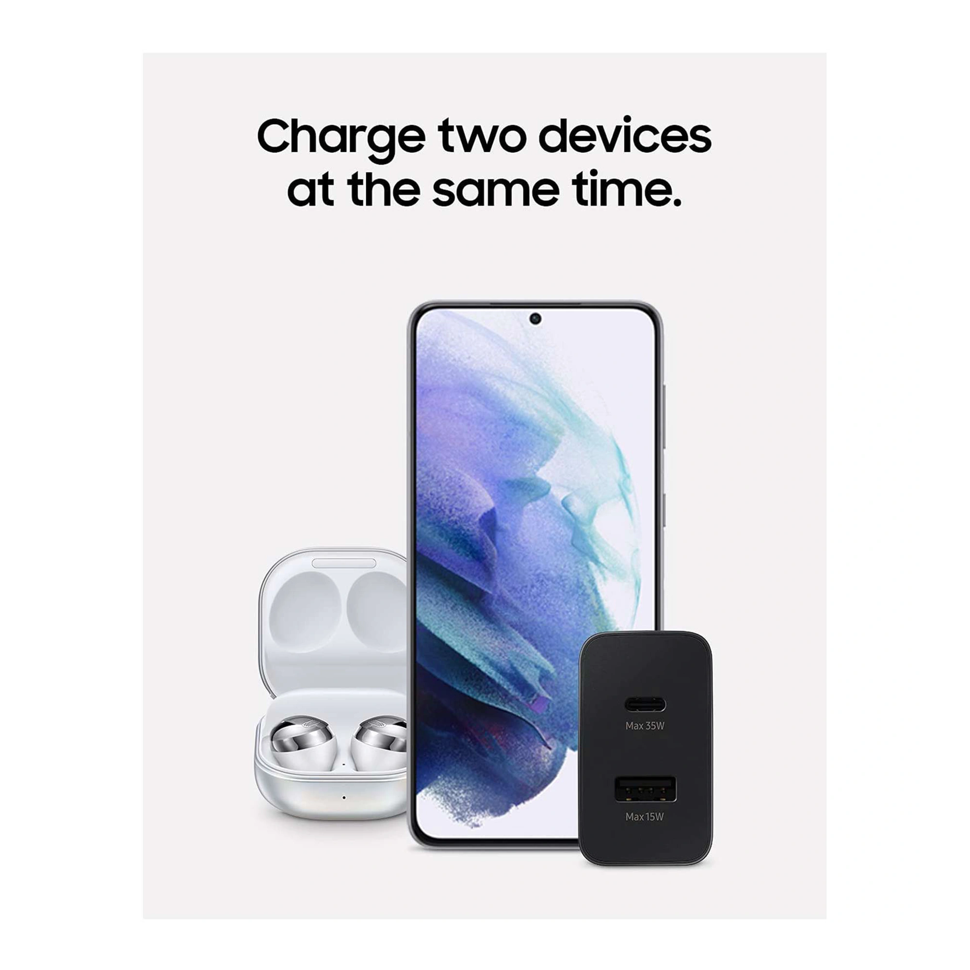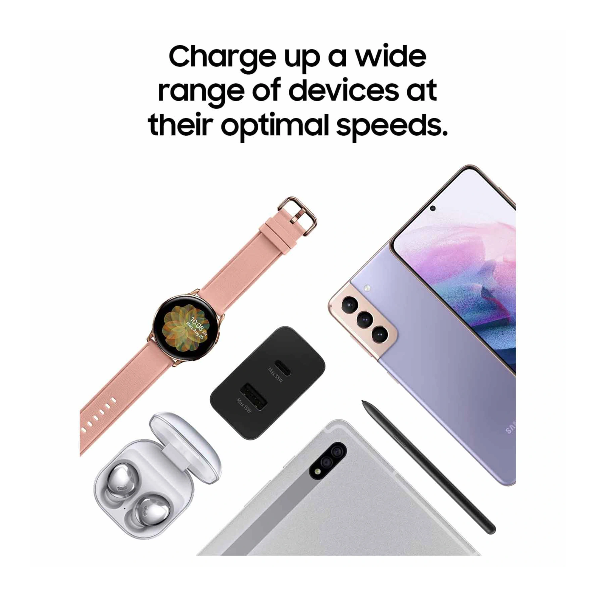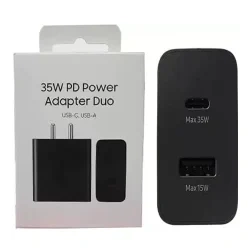The Samsung 35W Power Adapter Duo TA220 is a compact dual-port USB-C and USB-A wall charger delivering up to 35 W Super Fast Charging with support for PD 3.0, PPS, AFC and Quick Charge protocols, compatible with Android and iOS smartphones, tablets, earbuds and other USB devices—making it perfect for daily home, office or travel charging—so if you want a versatile Samsung-branded adapter that can safely and efficiently power two devices at once, this is a dependable choice.