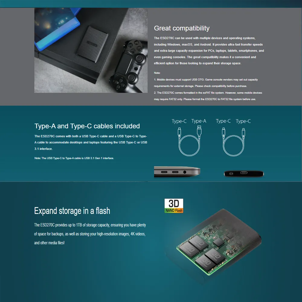 2. The ESD270C comes formatted in the exFAT file system. However, some mobile devices may require FAT32 only. Please format the ESD270C to FAT32 file system before use.