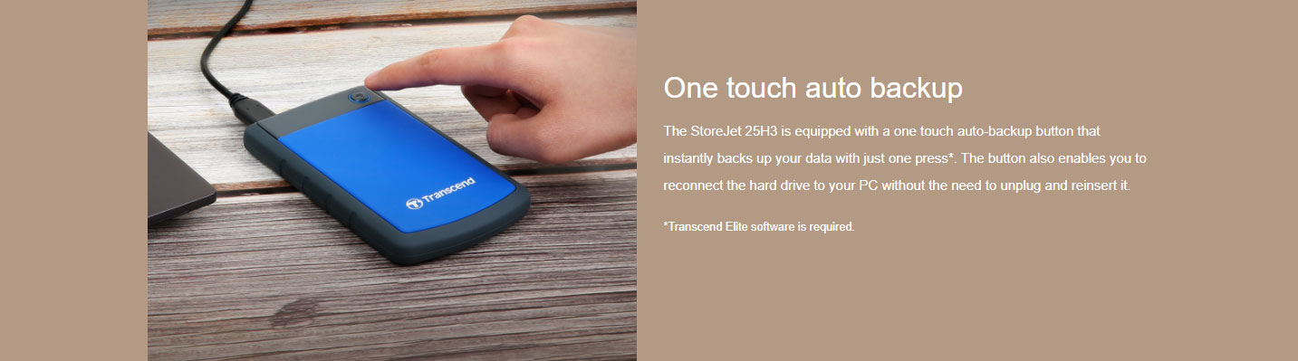 One touch auto backup: The StoreJet 25H3 is equipped with a one touch auto-backup button that instantly backs up your data with just one press*. The button also enables you to reconnect the hard drive to your PC without the need to unplug and reinsert it.
