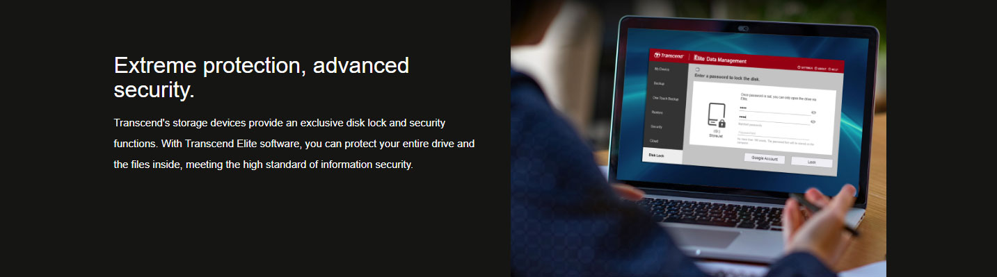 Extreme protection, advanced security.: Transcend's storage devices provide an exclusive disk lock and security functions. With Transcend Elite software, you can protect your entire drive and the files inside, meeting the high standard of information security.