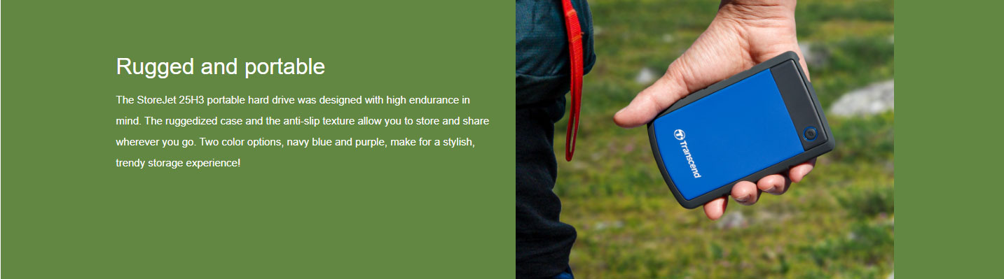 Rugged and portable :The StoreJet 25H3 portable hard drive was designed with high endurance in mind. The ruggedized case and the anti-slip texture allow you to store and share wherever you go. Two color options, navy blue and purple, make for a stylish, trendy storage experience!