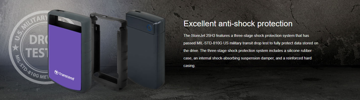 Excellent anti-shock protection: The StoreJet 25H3 features a three-stage shock protection system that has passed MIL-STD-810G US military transit drop test to fully protect data stored on the drive. The three-stage shock protection system includes a silicone rubber case, an internal shock-absorbing suspension damper, and a reinforced hard casing.