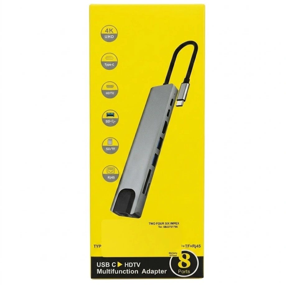 The Type-C 8-in-1 Multifunction USB-C Hub Adapter is a powerful connectivity solution designed for modern laptops and USB-C devices. It expands a single Type-C port into multiple essential connections including HDMI, USB ports, SD/TF card reader, and RJ45 Ethernet, allowing you to connect everything you need in one compact hub. With 4K UHD HDMI output, you can easily extend or mirror your screen to a larger monitor or TV for work, presentations, or entertainment. The high-speed USB ports support fast data transfer, while the Ethernet port provides stable wired internet. Ideal for professionals, students, and travelers, this hub improves productivity and convenience for everyday computing.