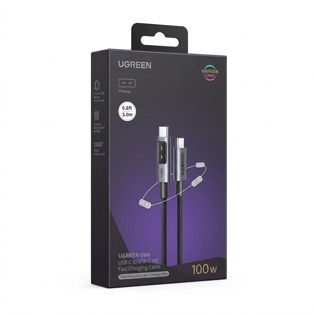 Experience the future of charging. The UGREEN Uno 100W USB-C to USB-C cable delivers blistering charging speeds, letting you power up your MacBook Pro or other demanding devices from dead to nearly full in incredibly short times. But raw power means nothing without control. This cable features an advanced, integrated E-Marker chip that constantly communicates with your device, dynamically adjusting power output to guarantee the safest, most stable, and efficient charging curve, protecting your battery from potential damage. It’s not just fast; it’s smart.