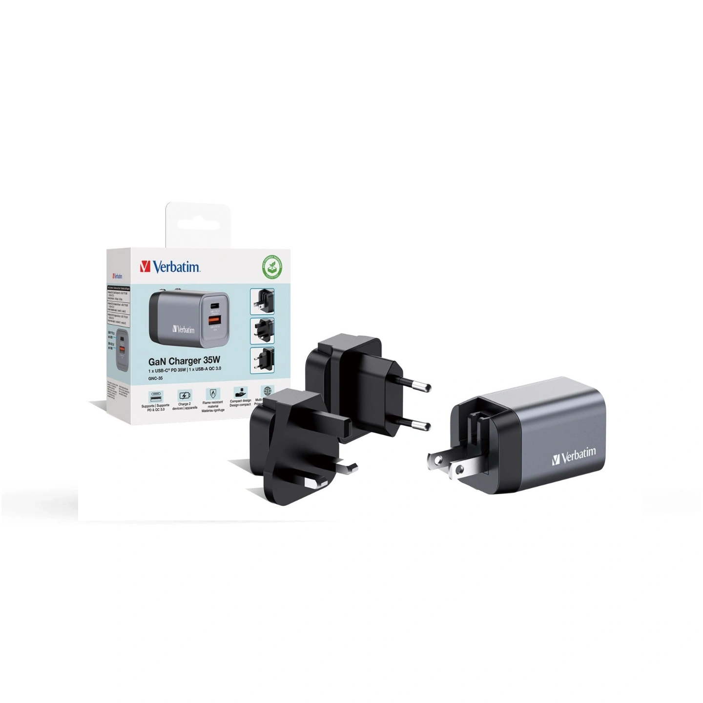 The Verbatim 35W GaN 2-in-1 Charger features a USB-C PD and USB-A Quick Charge port in a compact GaN-powered design that delivers efficient fast charging for smartphones, tablets, and other USB devices while being travel-friendly and safe—with broad compatibility across USB-C PD and QC-enabled gadgets such as iPhones, Samsung phones, iPads, Bluetooth accessories, and more, making it suitable for everyday home, office, or travel use, so if you want a reliable dual-device charger that’s efficient and portable, this is a smart pick for streamlined charging.