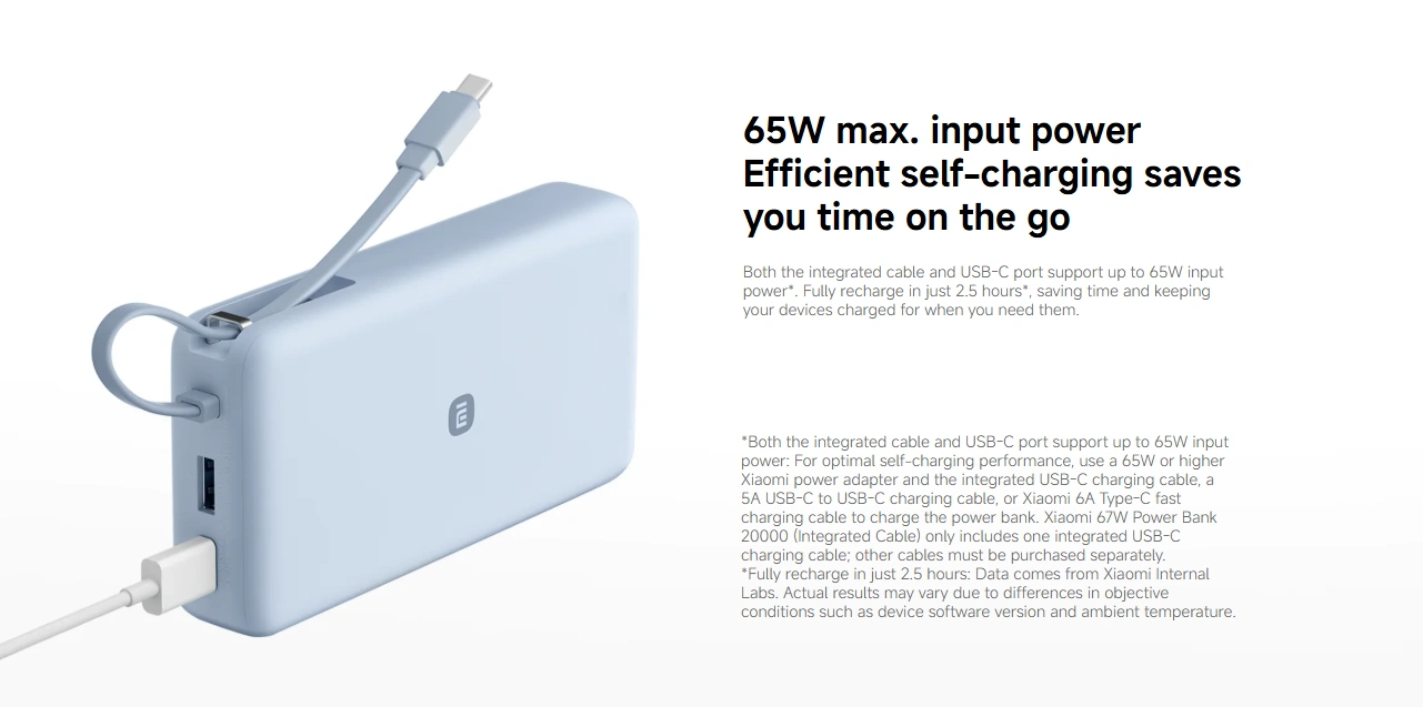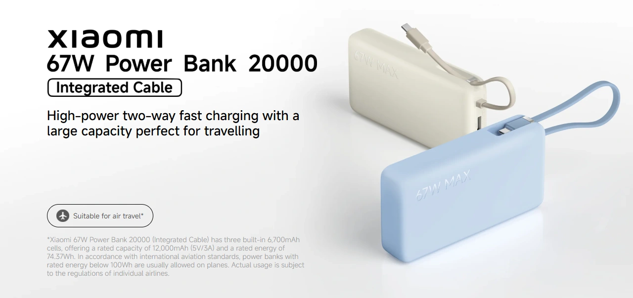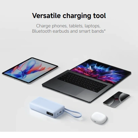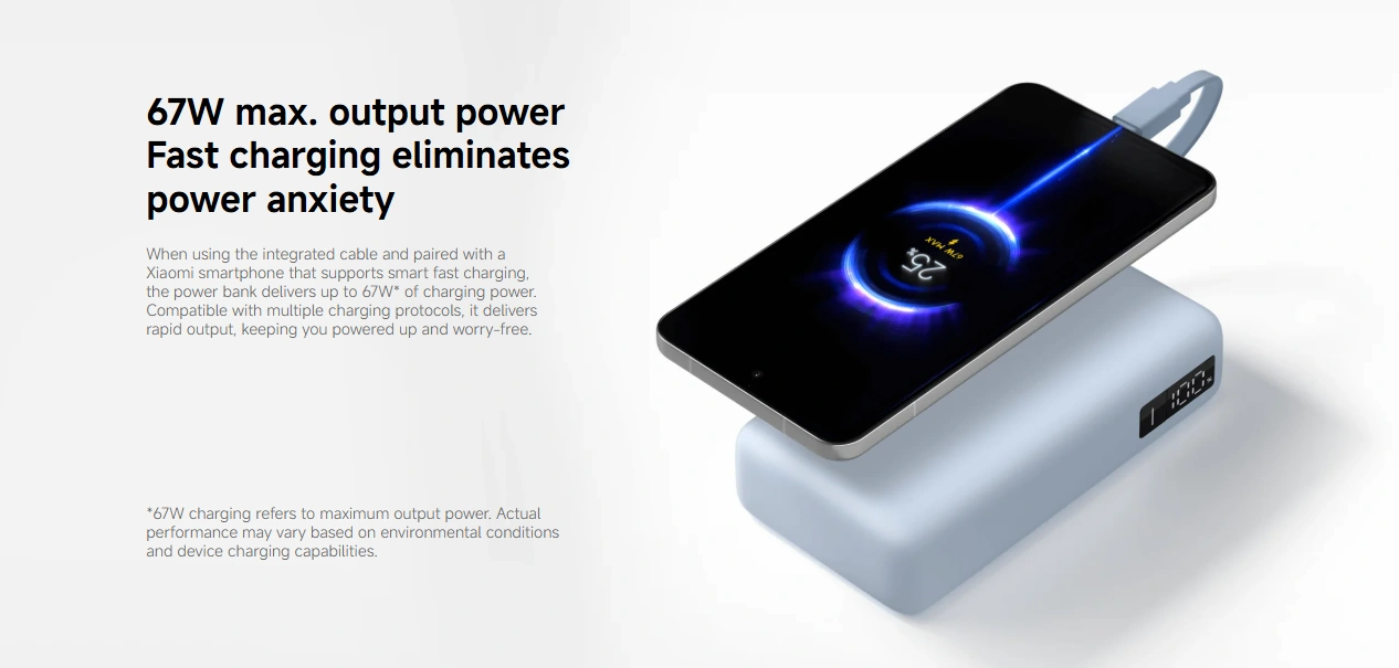 The Xiaomi 20000mAh 67W Fast Charging Power Bank is the ultimate power backup designed for heavy users. With a built-in cable and USB-C PD support, you don’t need to carry extra cables — just plug and charge anywhere. The 67W fast output can quickly charge not only flagship smartphones but even laptops, making it perfect for travel, office use, and outdoor activities. Its smart safety chip ensures stable charging while protecting your devices from damage. It removes battery anxiety from daily life and gives you real freedom.
